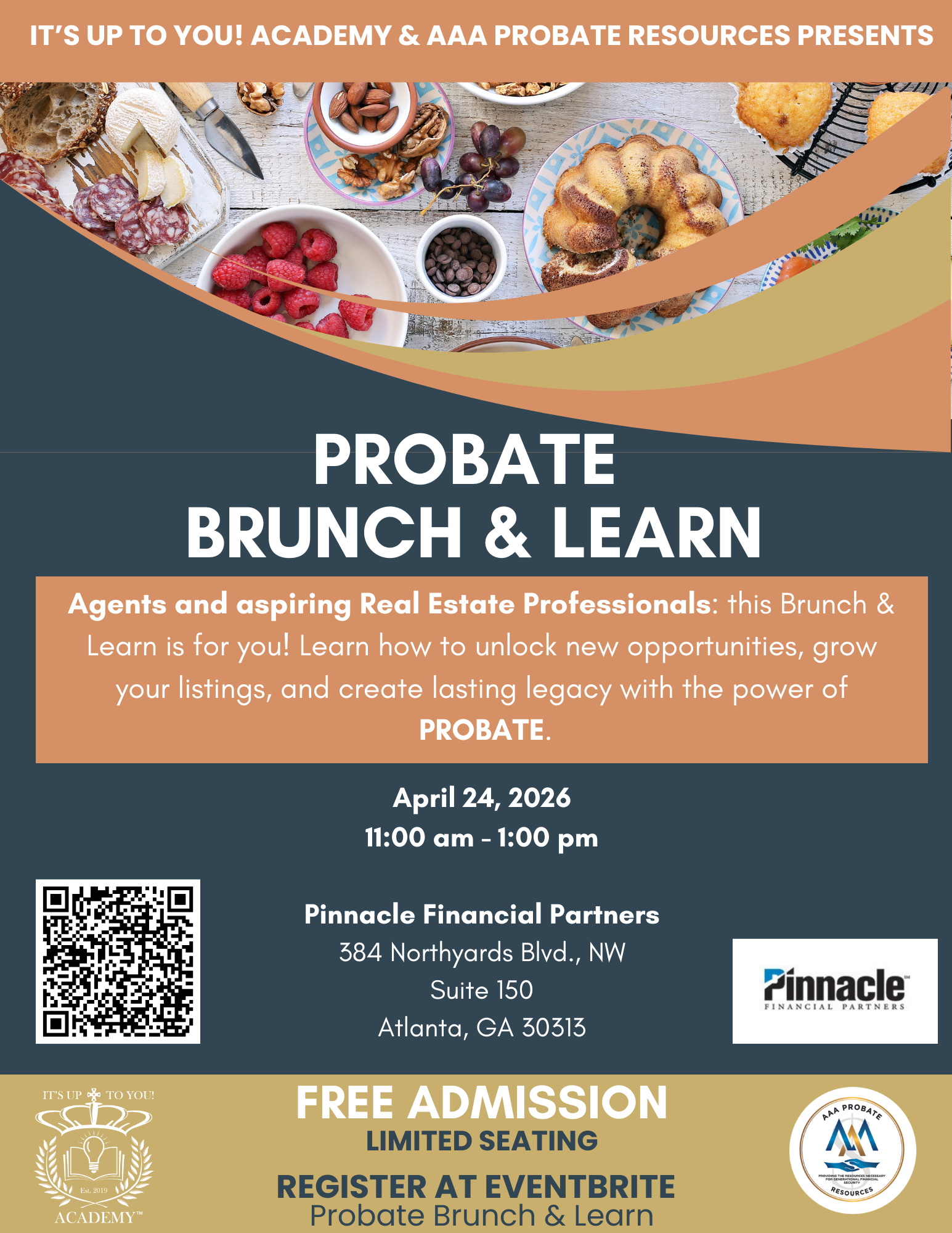Join us on Friday, April 24, 2026, from 11:00 am to 1:00 pm at Pinnacle Financial Partners in Atlanta, GA, for this informative and inspiring event. Enjoy a delicious brunch while learning how to build generational wealth, secure listings, and position yourself as a probate expert in your market.