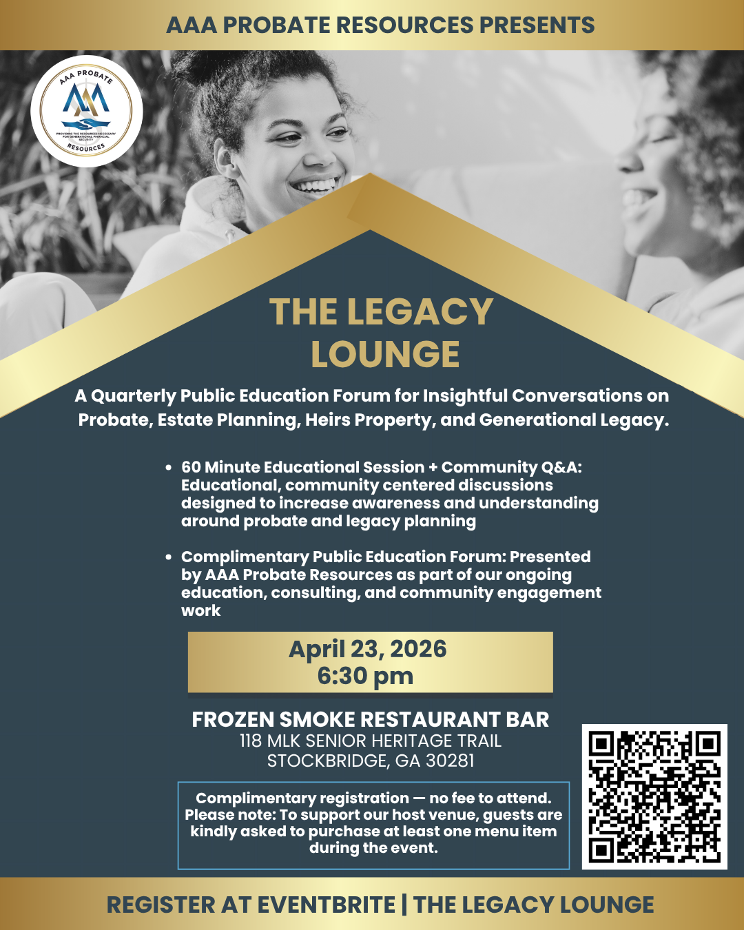 The Legacy Lounge, a quarterly public education forum powered by AAA Probate Resources. Each session brings community members together for thoughtful, scenario-based conversations about probate, heirs property, estate planning, and generational legacy.